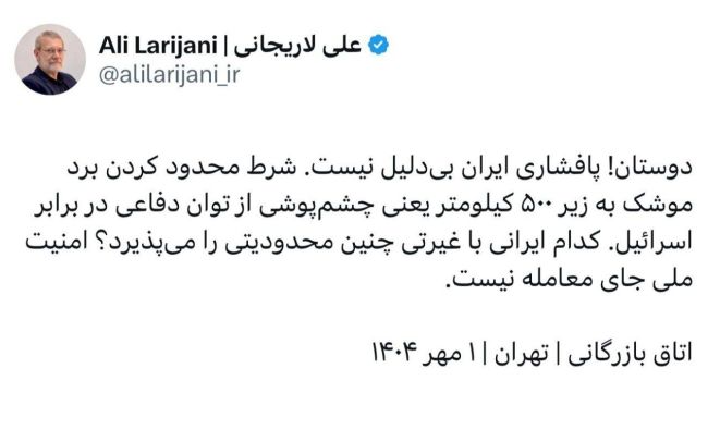 علی لاریجانی، دبیر شورای عالی امنیت ملی در شبکه اجتماعی ایکس نوشت: پافشاری ایران بی‌دلیل نیست. شرط محدود کردن برد موشک به زیر ۵۰۰ کیلومتر یعنی چشم‌پوشی از توان دفاعی در برابر اسرائیل. کدام ایرانی با غیرتی چنین محدودیتی را می‌پذیرد؟ امنیت ملی جای معامله نیست.