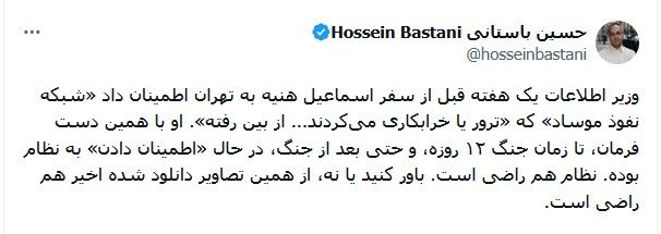 حسین باستانی، تحلیلگر سیاسی مسائل ایران در حساب خود در شبکه ایکس در این خصوص مینویسد: «وزیر اطلاعات یک هفته قبل از سفر اسماعیل هنیه به تهران اطمینان داد شبکه نفوذ موساد که ترور یا خرابکاری میکردند... از بین رفته. او با همین دست فرمان، تا زمان جنگ ۱۲ روزه، و حتی بعد از جنگ، در حال اطمینان دادن به نظام بوده. نظام هم راضی است. باور کنید یا نه، از همین تصاویر دانلود شده اخیر هم راضی است.»