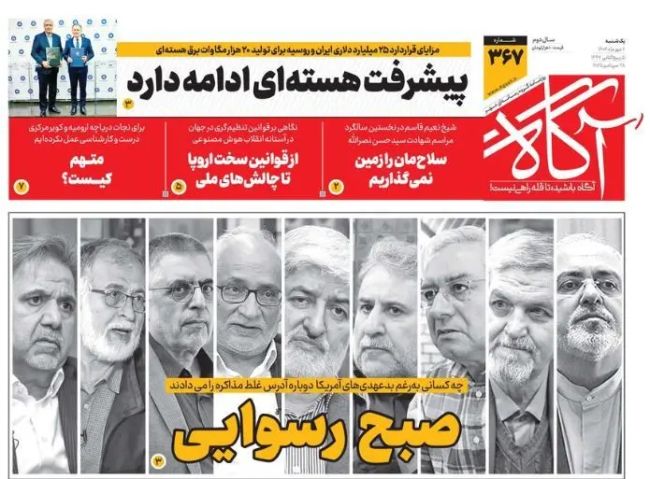 روزنامه آگاه که متعلق به موسسه رسانهای مهر و وابسته به سازمان تبلیغات اسلامی استروزنامه آگاه با تیتر «صبح رسوایی» عکس تعدادی از مقامات پیشین از جمله جواد ظریف، غلامحسین کرباسچی و علی مطهری را در صفحه اول منتشر کرد و نوشت: «چه کسانی به رغم بدعهدیهای آمریکا دوباره آدرس غلط مذاکره را میدادند.»در یادداشت این روزنامه با تاکید و تکرار اظهارات آیتالله خامنهای در «بیفایده بودن مذاکره با آمریکا» آمده است: