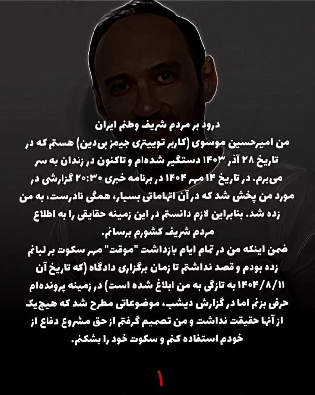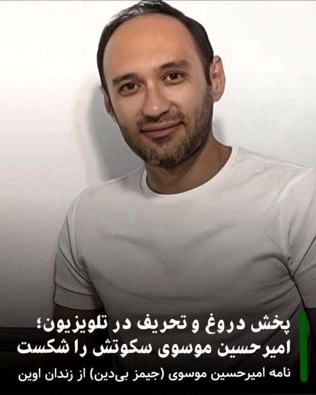 ایران اینترنشنال: امیرحسین موسوی، فعال پیشین شبکههای اجتماعی، در نامهای از زندان اوین اتهامات مطرحشده علیه خود در گزارش اخیر صداوسیمای جمهوری اسلامی را رد کرد و گفت اعترافاتی که در این برنامه از او پخش شده، «اجباری» بوده و تحت فشار بازجو گرفته شده است.این نامه سهشنبه ۱۵ مهر در صفحه اینستاگرام مهدی محمودیان، دیگر زندانی سیاسی محبوس در ایران، منتشر شد.