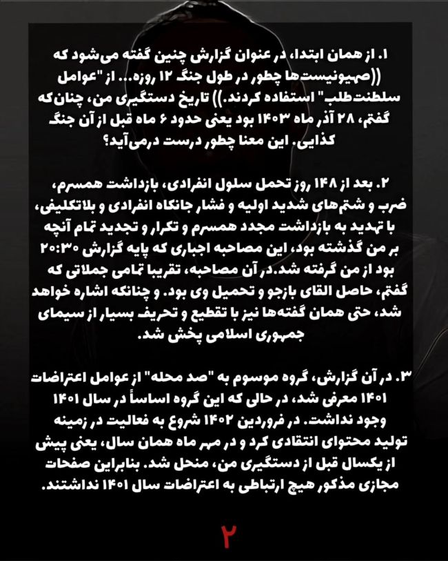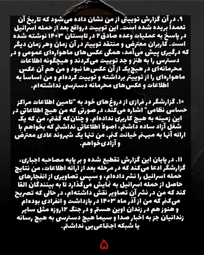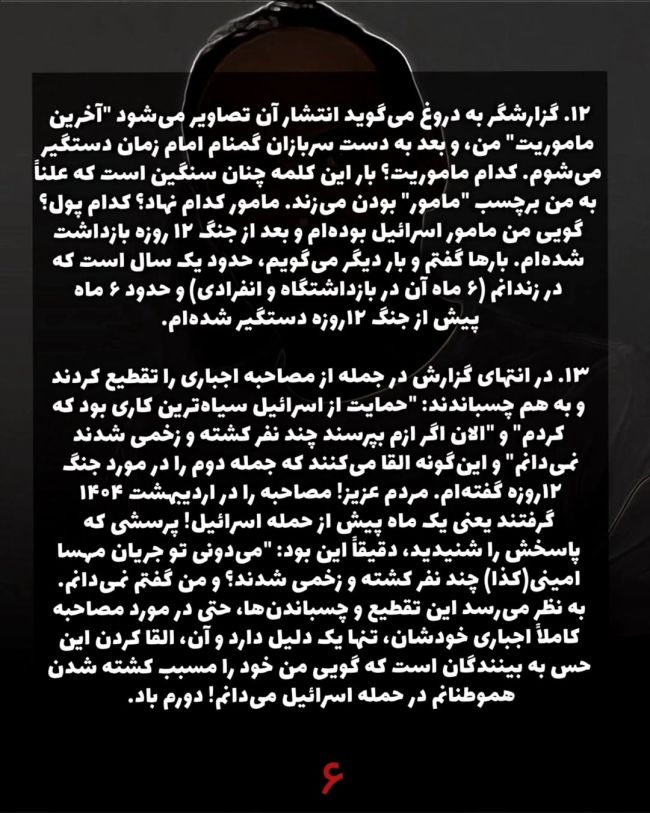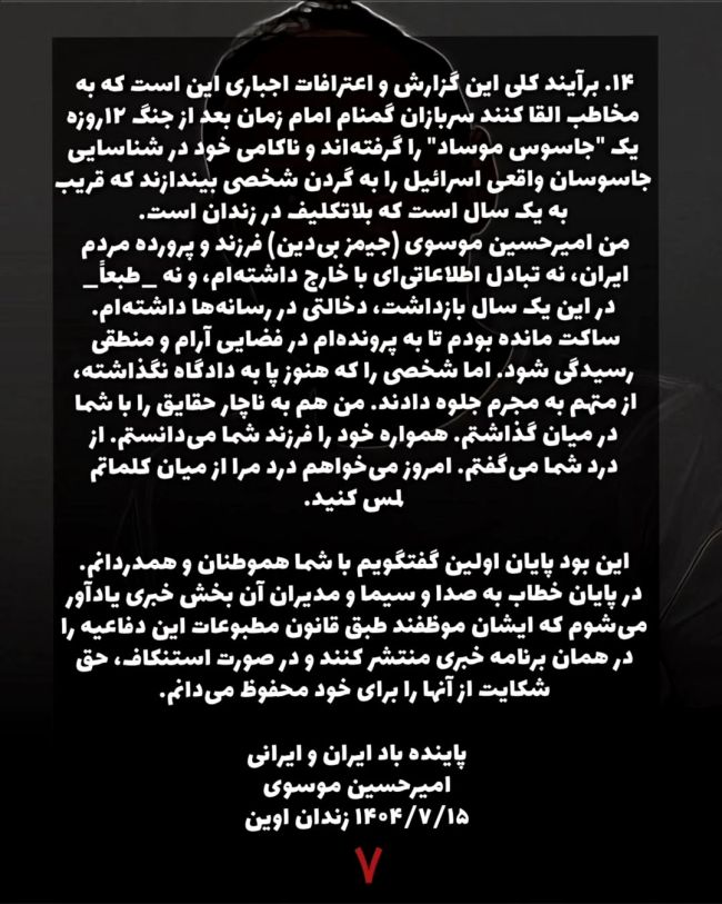 موسوی که از آذر ۱۴۰۳ در «بازداشت موقت» به سر میبرد، در این نامه تاکید کرد ویدیوی اعترافات اجباری اردیبهشتماه و یک ماه پیش از جنگ ۱۲ روزه جمهوری اسلامی و اسرائیل ضبط شده و حکومت اکنون میکوشد با تحریف وقایع، او را بهعنوان «جاسوس» موساد معرفی کند.