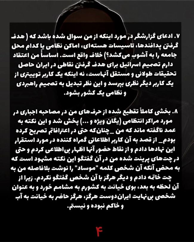این زندانی سیاسی همچنین اتهام ارتباط با عوامل موساد در فضای مجازی را رد کرد و از مقامهای جمهوری اسلامی خواست در صورت در اختیار داشتن هرگونه مدرک در این زمینه، آن را بهصورت علنی منتشر کنند.