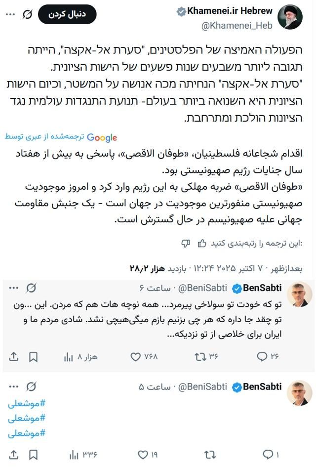 بن سبطی در پاسخ به پیام خامنه ای در شبکه اکس نوشت: