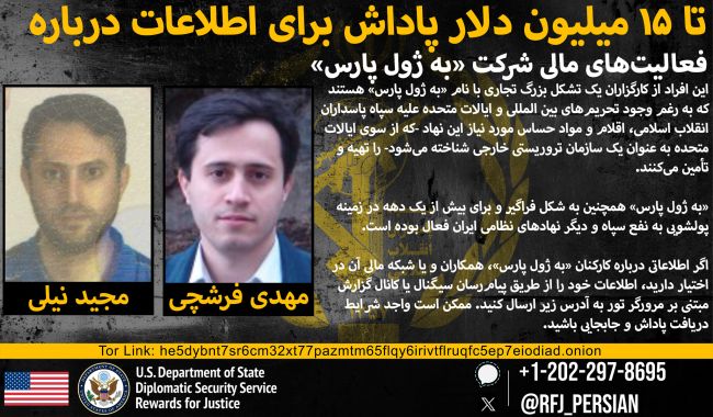 وزارت خارجه آمریکا برای ارائه اطلاعات درباره دو ایرانی به نام مهدی فرشچی و مجید نیلی که از طریق شرکت «بهژول پارس» اقدام به تامین «تکنولوژی حساس مورد نیاز صنایع نظامی» جمهوری اسلامی و سپاه پاسداران کردهاند، تا ۱۵ میلیون دلار پاداش تایید کرد.