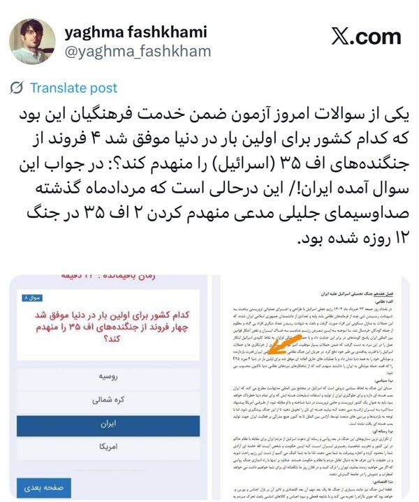 یکی از سوالات امروز آزمون ضمن خدمت فرهنگیان این بود که کدام کشور برای اولین بار در دنیا موفق شد ۴ فروند از جنگندههای اف ۳۵ (اسرائیل) را منهدم کند؟: در جواب این سوال آمده ایران!/ این درحالی است که مردادماه گذشته صداوسیمای جلیلی مدعی منهدم کردن ۲ اف ۳۵ در جنگ ۱۲ روزه شده بود
