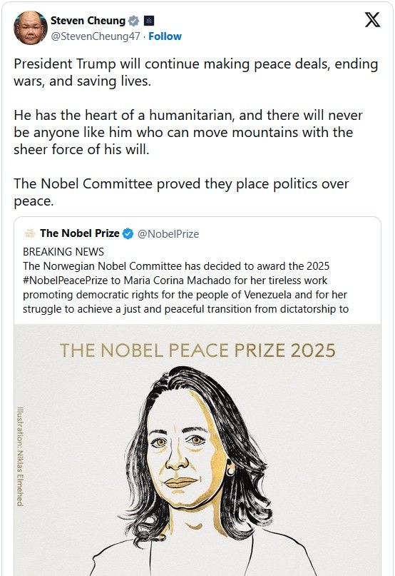 این بیانیه پس از آن اعلام شد که جایزه صلح نوبل سال ۲۰۲۵ به ماریا کورینا ماچادو، رهبر مخالفان ونزوئلا، به دلیل "مبارزه شجاعانه برای آزادی و دموکراسی" اعطا شد.