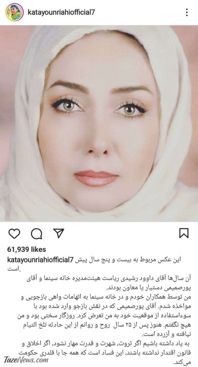 3 سال پیش کتایون ریاحی، بازیگر سینما در یک رشته استوری با انتشار تصویری از سعید پورصمیمی بازیگر فیلم «برادران لیلا» به جنبش من هم/ Me Too پیوست.