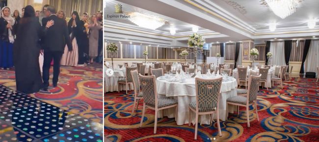 تصویر سمت راست، تصویر منتشر شده در وبسایت هتل اسپیناس و تصویر سمت چپ مربوط به مراسم عروسی دختر علی شمخانی استبه گزارش رویداد۲۴، در حال حاضر هزینه شام هر مهمان در این هتل از حدود ۳ میلیون و ۸۰۰ هزار تومان تا ۵ میلیون تومان متغیر است. کمهزینهترین منوی تشریفاتی این تالار شامل بیش از ۲۵ نوع غذا، دسر و پیشغذاست و منوهای گرانتر تا ۷۰ نوع خوراکی را در بر میگیرند. این تالار برای گلآرایی هر میز بیش از یک میلیون تومان دریافت میکند و بر اساس تصاویر، گلآرایی ورودی سالن بهتنهایی بیش از ۵۰ میلیون تومان هزینه در برداشته است. در نتیجه، برگزاری یک مراسم عروسی در هتل اسپیناس پالاس با احتساب هزینههای جانبی مانند نورپردازی، گلآرایی، سیستم صوتی، ورودی سالن و جایگاهها میتواند بیش از چهار میلیارد تومان هزینه داشته باشد.استودیوی لاکچری عکاسی برای خانواده امنیتی