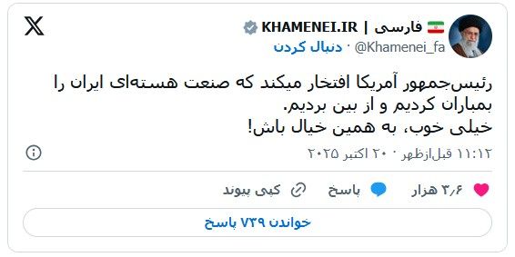 خامنه‌ای: به همین خیال باشید که با بمباران، صنعت هسته‌ای ایران از بین می‌رود