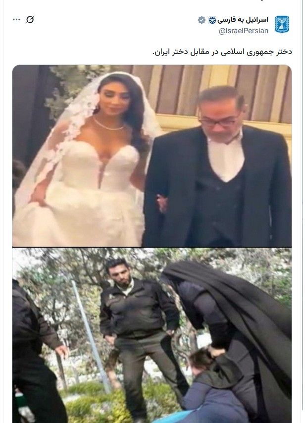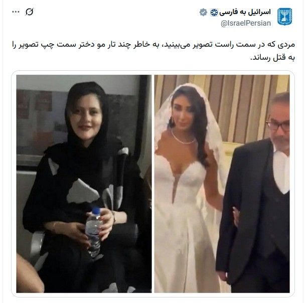حساب فارسیزبان وزارت خارجه اسرائیل با انتشار تصویری از مراسم عروسی دختر علی شمخانی، دبیر سابق شورای عالی امنیت ملی جمهوری اسلامی و مهساژینا امینی، نوشت: «مردی که در سمت راست تصویر میبینید به خاطر چند تار مو دختر سمپ چپ تصویر را به قتل رساند.»