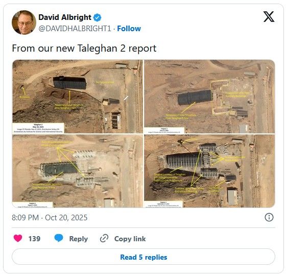 دیوید آلبرایت، بازرس پیشین آژانس بینالمللی انرژی اتمی و رئیس موسسه علوم و امنیت بینالمللی در شبکه اجتماعی ایکس نوشت: « در حالی که بررسیهای ما درباره تاسیسات «طالقان ۲» ادامه دارد، بیشازپیش به این نتیجه رسیدهایم که تاسیسات بازسازیشده طالقان ۲ با استفاده از سازوکاری تله انفجار، به نظر میرسد برای کاهش اثر انفجار حملات هوایی احتمالی طراحی شده است.»