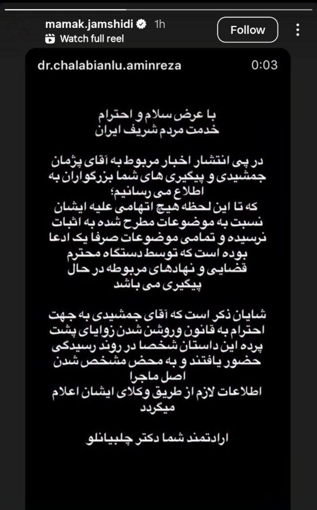 اما این بازیگر با انتشار ویدیویی در صفحه شخصی خود گفت: «من هیچ شکایتی از پژمان جمشیدی نکردهام و شاکی این پرونده نیستم و این تشابه اسمی است»
