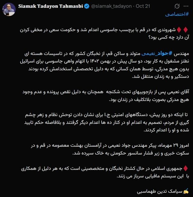 ایران اینترنشنال: گزارشها از ایران حاکی است فردی که به اتهام «جاسوسی» در زندان مرکزی قم اعدام شد، جواد نعیمی نام داشته است. به گفته منابع خبری، او از کارشناسان فعال در تاسیسات هستهای نطنز و ساکن شهر قم بوده است.به گزارش خبرگزاری میزان، وابسته به قوه قضاییه جمهوری اسلامی، کاظم موسوی، رییس کل دادگستری و رییس شورای قضایی استان قم، یکشنبه ۲۷ مهر از اجرای حکم اعدام یک «جاسوس موساد» در بامداد شنبه ۲۶ مهر خبر داد.