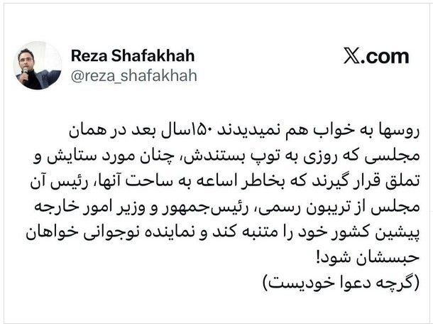 ساختمان مجلس پس از بهتوپبستهشدن به دستور ژنرال لیاخوف، تهران، ۱۹۰۸روسها در خواب هم نمیدیدند؛ در همان مجلسی که به توپ بستند، ستایش شوند!روسها به خواب هم نمیدیدند ۱۵۰سال بعد در همان مجلسی که روزی به توپ بستندش، چنان مورد ستایش و تملق قرار گیرند که بخاطر اساعه به ساحت آنها، رئیس آن مجلس از تریبون رسمی، رئیسجمهور و وزیر امور خارجه پیشین کشور خود را متنبه کند و نماینده نوجوانی خواهان حبسشان شود!