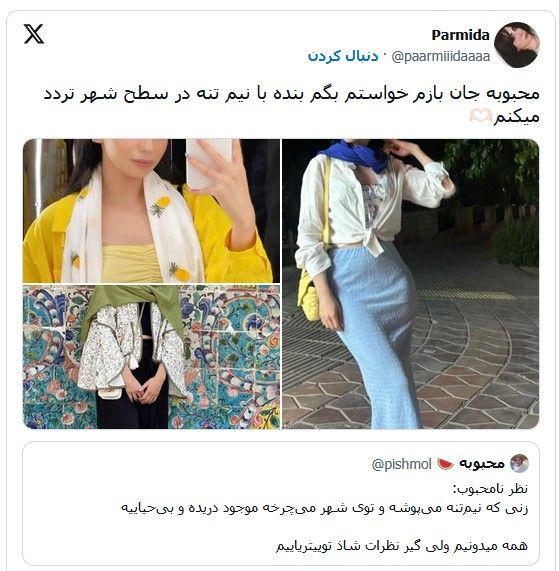 تنها در یک نمونه، کاربران زن در واکنش به کاربری که در حساب ایکس خود نوشته بود زنانی که در شهر با نیمتنه تردد میکنند، «دریده و بیحیا» هستند، تعداد زیادی تصویر با نیمتنه از خود منتشر کردند.