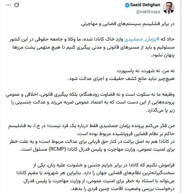 از جمله «سعید دهقان» وکیل شناختهشده ایرانی ساکن کانادا در حساب کاربری توییتر خود نوشت: «حالا که پژمان جمشیدی وارد خاک کانادا شده، ما وکلا و جامعه حقوقی در این کشور مسوولیم و باید از مسیرهای قانونی و مدنی پیگیری کنیم تا هیچ متهمی پشت مرزها پنهان نشود.»