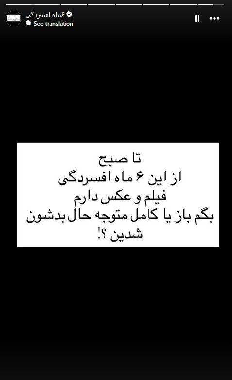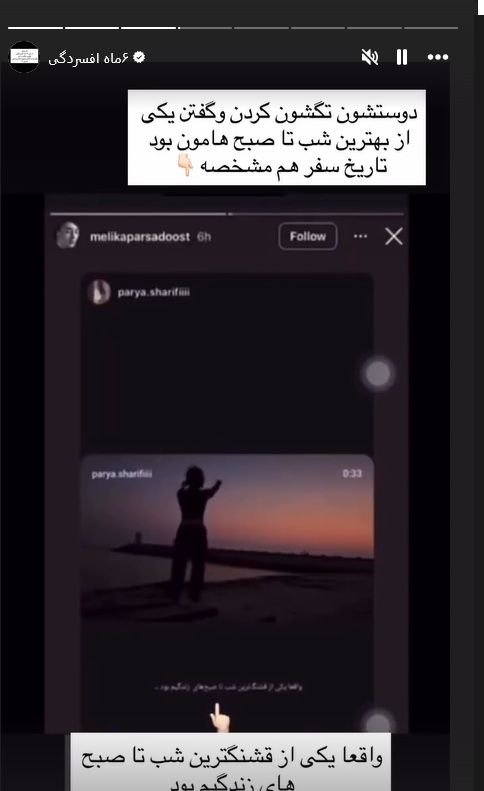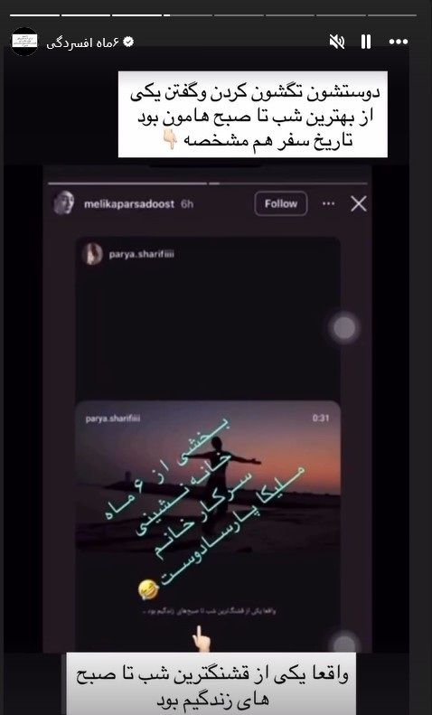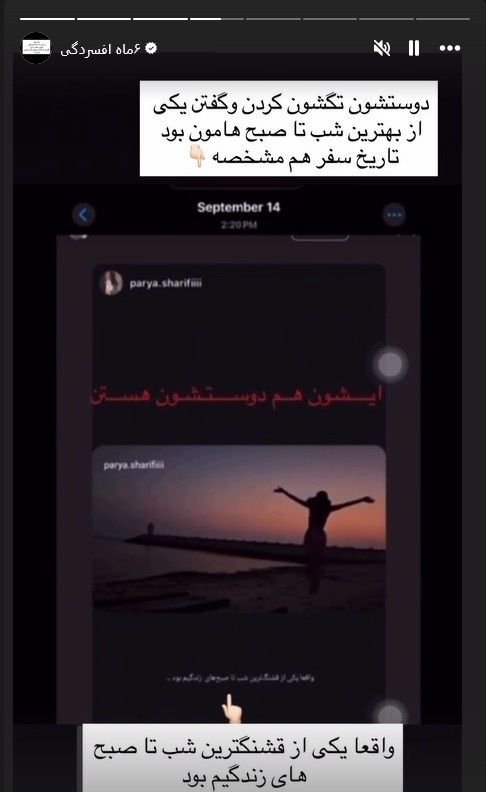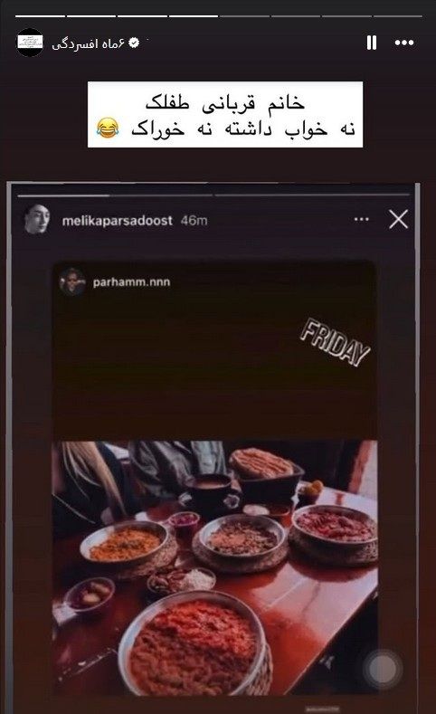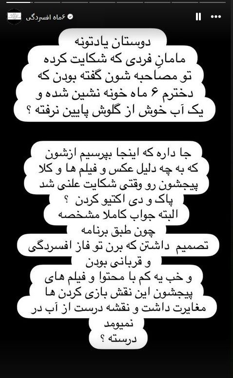 او استوری هایش را با این نوشته آغاز کرد: «دوستان یادتونه مامان فردی که شکایت کرده تو مصاحبشون گفته بودن که دخترم ۶ ماه خونه نشین شده و یک آب جوش از گلوش پایین نرفته؟ جا داره که اینجا بپرسم ازشون که به چه دلیل عکس و فیلم ها و کلا پیجشون رو وقتی شکایت علنی شد پاک و دی اکتیو کردن؟ البته جواب کاملا مشخصه چون طبق برنامه تصمیم داشتن که برن تو فاز افسردگی و قربانی بودن و خب یه کم با محتوا و فیلم های پیجشون این نقش بازی کردن ها مغایرت داشت و نقشه درست از آب درنمیومد، درسته؟»