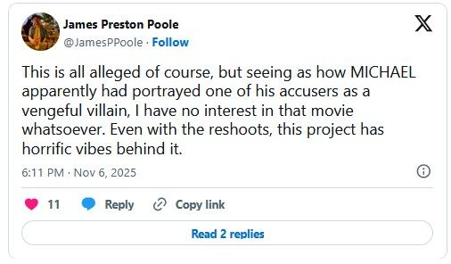 دن رید، کارگردان مستند Leaving Neverland که ادعاهای سوءاستفاده جنسی از کودکان علیه مایکل جکسون را روایت میکرد، پیشتر ساخت این زندگینامه سینمایی را نقد کرده و گفته بود که این فیلم «به تجلیل از مردی خواهد پرداخت که به کودکان تجاوز کرده است.»