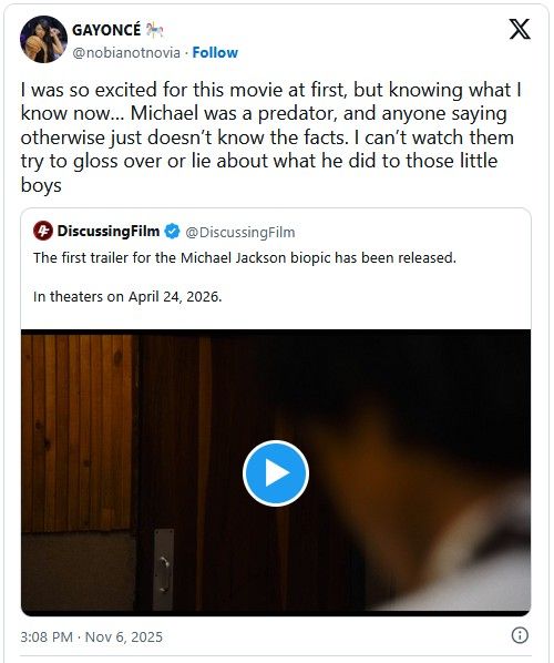او ادامه داد: «اینکه اعلام خبر ساخت این فیلم با هیچ موج خشم و اعتراضی همراه نشده، به ما میگوید که فریبندگی جکسون هنوز نیرویی زنده است که از آنسوی گور عمل میکند.»