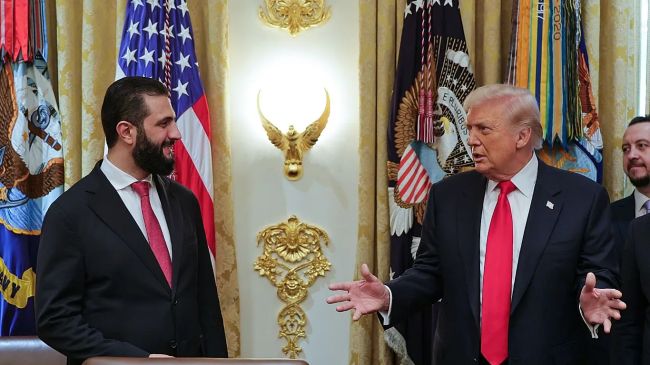 عکس منتشر شده توسط دفتر مطبوعاتی ریاست جمهوری سوریه از دیدار ترامپ (راست)، با رئیس جمهور سوریه، الشرع، در کاخ سفید در واشنگتنگمانهها از پیوستن سوریه به ائتلاف جهانی مبارزه با گروه داعشهمچنین خبرگزاری «بلومبرگ» به نقل از منابعی گزارش داد که سوریه به ائتلاف تحت رهبری آمریکا برای مبارزه با گروه داعش خواهد پیوست.