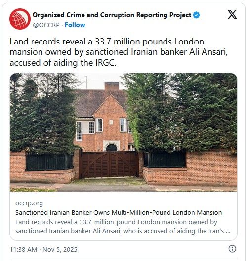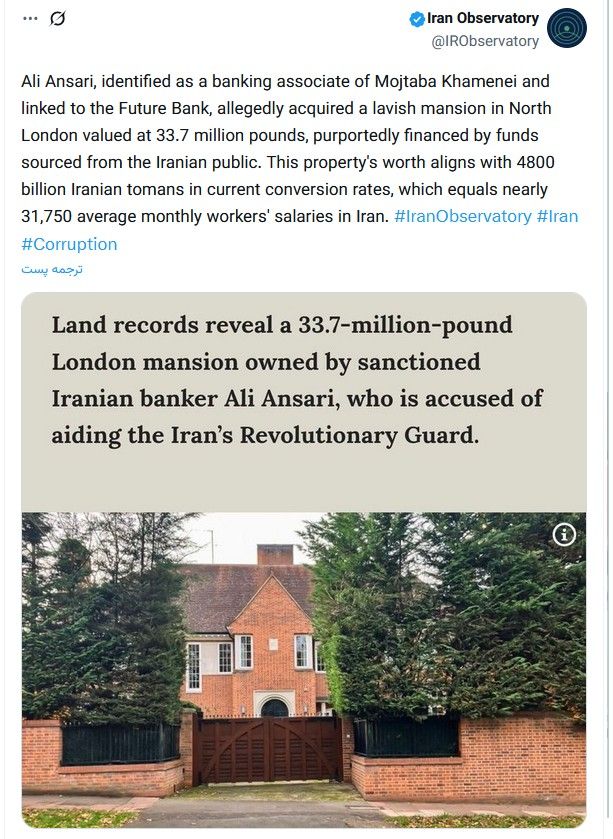 یورونیوز: به گزارش تایمز، علی انصاری، سهامدار اصلی بانک منحلشده آینده مالک چندین عمارت به ارزش در مجموع ۱۴۲ میلیون پوند در یکی از محلات اعیاننشین لندن موسوم به «خیابان میلیاردرها» است. بریتانیا در اواخر ماه اکتبر آقای انصاری را به اتهام حمایت مالی از سپاه پاسداران تحریم کرد.