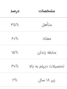 ۳۵% متأهل، ۳۰% دیپلم به بالا، ۲% زیر ۱۸ سال