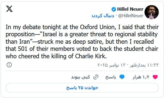 مدیر اجرایی سازمان دیدهبان سازمان ملل بعدا در شبکه اجتماعی ایکس نوشت: «در مناظره امشب در مجمع آکسفورد، گفتم که ادعای آنها مبنی بر اینکه اسرائیل تهدیدی بزرگتر برای ثبات منطقهای نسبت به ایران است، برای من طنز عمیقی به نظر میرسید، اما سپس یادم آمد که ۵۰۱ نفر از اعضای آنها به حمایت از رییس مجمع دانشجویی که برای کشته شدن چارلی کرک شادی کرد، رای دادند.»ماه گذشته، جورج آباراونه، رییس مجمع آکسفورد، پس از واکنشهای شدید نسبت به خرسندی ظاهری او از تیراندازی به کرک، از سمت خود کنار گذاشته شد.