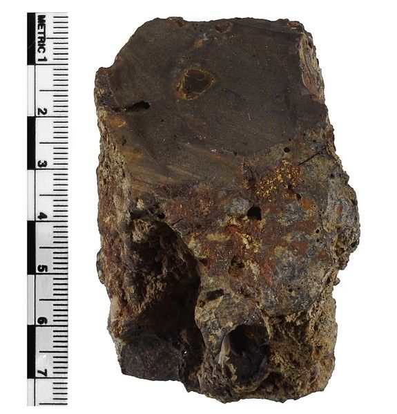 سطح برش‌خورده یک سرباره که یک تکه به‌دام‌افتاده زغال را نشان می‌دهدخواندن تاریخ درون سرباره