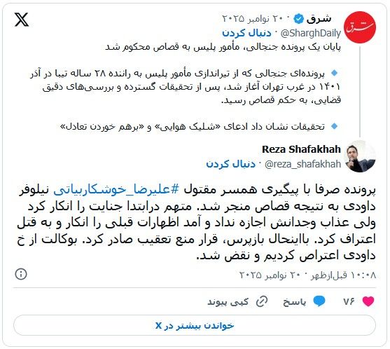 رضا شفاخواه، وکیل دادگستری، با انتشار مطلبی در شبکه اجتماعی ایکس، درباره این پرونده اعلام کرد که رسیدگی مجدد به قتل خوشکار بیاتی با پیگیریهای مستمر همسر او، نیلوفر داودی و وکلای پرونده انجام شد و در نهایت، دادگاه بار دیگر حکم قصاص صادر کرد.