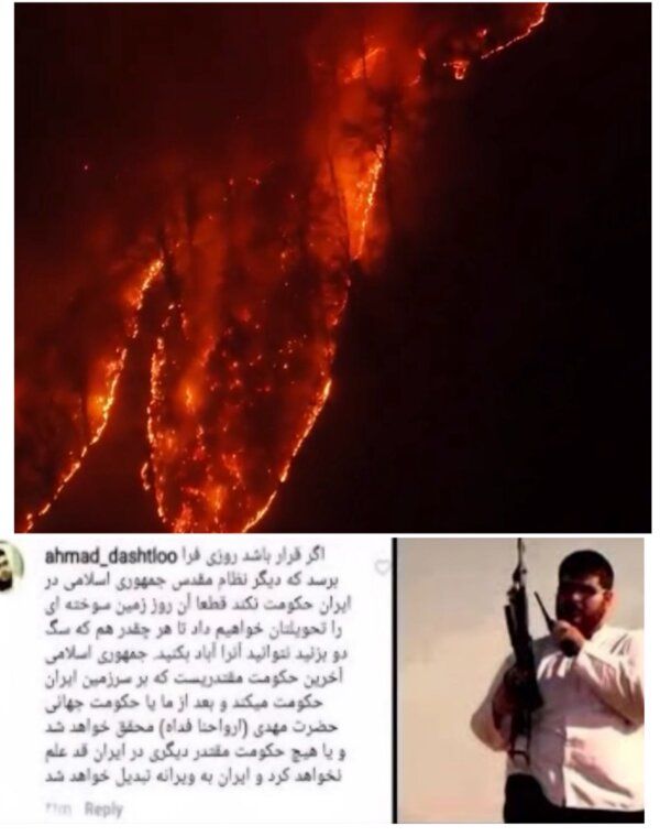 کامنت این عرزشی جدی نگرفتید ولی جدی جدی دارن ایران رو تبدیل به زمین سوخته میکنن!یک بسیجی مدافع جمهوری اسلامی به نام احمد دشتلو در پست خود نوشت: اگر قرار باشد روزی فرا برسد که دیگر نظام مقدس جمهوری اسلامی در ایران حکومت نکند قطعا آن روز زمین سوختهای را تحویلتان خواهیم داد تا هرچقدر هم که سگدو بزنید نتوانید آنرا آباد بکنید. جمهوری اسلامی آخرین حکومت مقتدریست که بر سرزمین ایران حکومت میکند و بعد از ما یا حکومت جهانی حضرت مهدی(ارواحنا فداه) محقق خواهد شد و یا هیچ حکومت مقتدر دیگری در ایران قد علم نخواهد کرد و ایران به ویرانه تبدیل خواهد شد.
