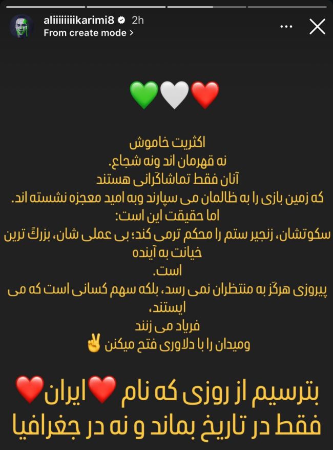علی کریمی در صفحه خود نوشت: اکثریت خاموش نه قهرماناند و نه شجاع.