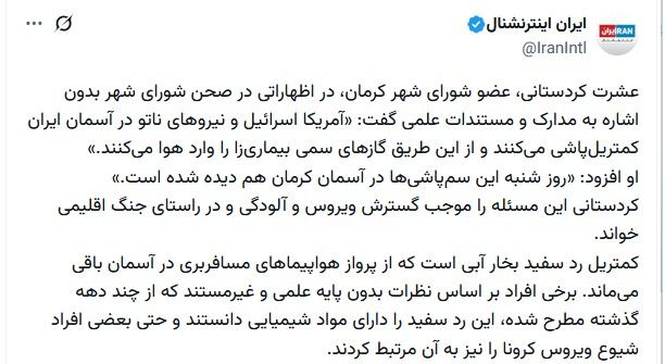 ایران اینترنشنال: سینا مصطفویدر پی خشکسالی و بحرانیتر شدن وضعیت منابع آب در شهرهای ایران، این گزاره که هواپیماها با «سمپاشی» در آسمان ایران (کمتریل) مانع بارور شدن ابرها میشوند، در شبکههای اجتماعی بازنشر شده است؛ گزارهای که مبتنی بر نظریههای تئوری توطئه است و فاقد هر گونه پایه و اساس علمی است.