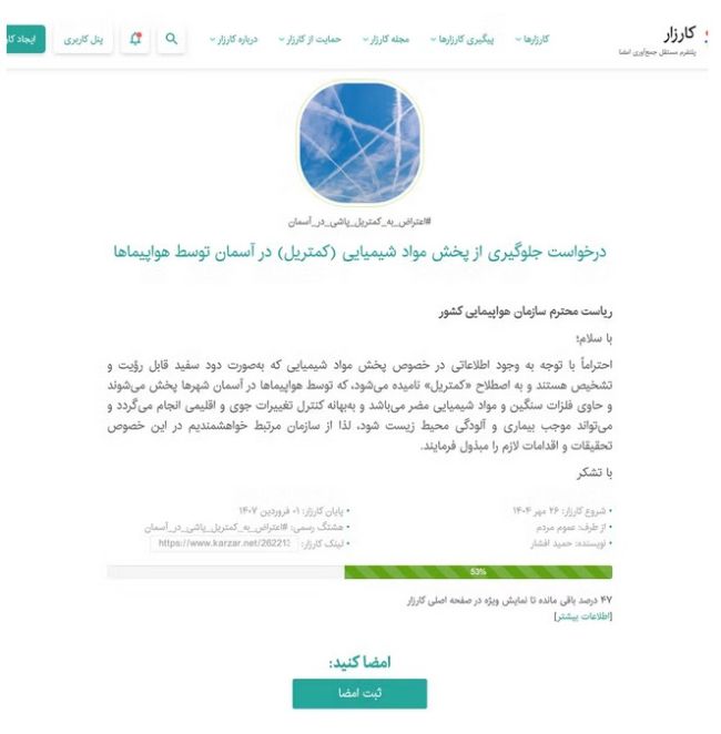 در ایران، باور به انجام این پروژههای خرابکارانه تا جایی شدت گرفته که حتی کارزاری برای جمعآوری امضا در وبسایت کارزار دات نت، با عنوان «درخواست جلوگیری از پخش مواد شیمیایی (کمتریل) در آسمان توسط هواپیماها» از ۲۶ مهر راهاندازی شده و ظرف یک ماه توانسته چند صد امضا هم جمع کند.