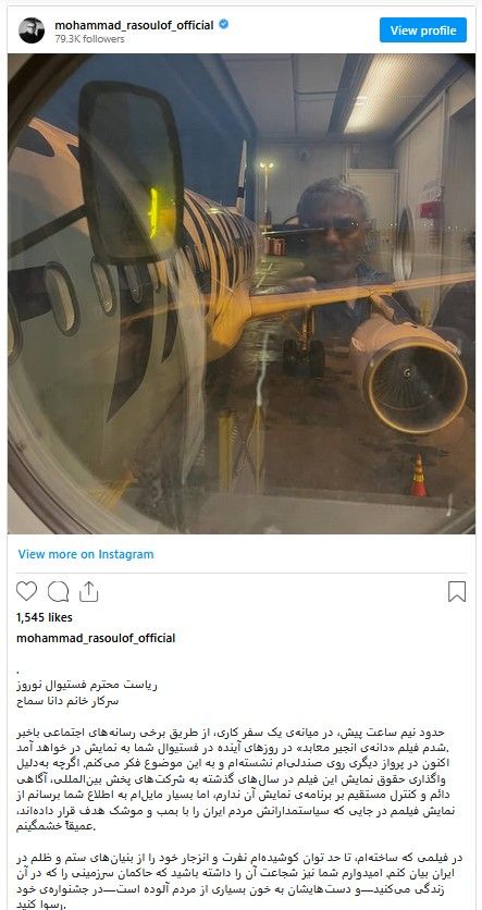 آقای رسول‌اف روز دوشنبه سوم آذر در پستی اینستاگرامی نوشته که از طریق شبکه‌های اجتماعی از نمایش فیلم خود با خبر شده و «اگرچه حقوق نمایش این فیلم به شرکت‌های پخش بین‌المللی واگذار شده» است، «اما از نمایش فیلمم در جایی که سیاستمدارانش مردم ایران را با بمب و موشک هدف قرار داده‌اند، عمیقاً خشمگینم».