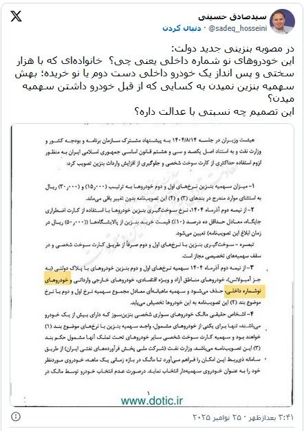 صادق الحسینی، کارشناس اقتصادی، نیز در ایکس نوشت: «ابلاغیه بنزینی دولت به هیچ وجه صحیح نیست. به نحوی که نه قاچاق را کم میکند، نه مشکل ناترازی را ذرهای بهبود میدهد، نه به کسری بودجه دولت کمک میکند و نه عادلانه است. فقط فضای سیاستی برای اصلاحات بزرگ را از بین میبرد. دولت هم چوب را میخورد هم پیاز را.»