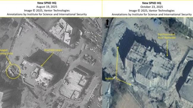 این موسسه بر اساس تصاویر ماهوارهای شرکت ونتور در فاصله بین ۲۸ مرداد تا اول آبان نوشت که ایران در حال تخریب این ساختمان است، سقف و طبقات بالایی ساختمان برداشته شده و تودههای بزرگی از آوار اطراف ساختمان را فرا گرفته است.
