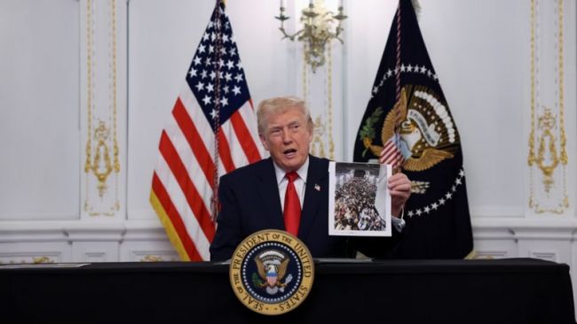 ترامپ با عکسی در دست دارد که بهگفته او مربوط به یک هواپیمای پناهجویان افغان استرادیو فردا: دونالد ترامپ، رئیسجمهور ایالات متحده، اعلام کرد دولت او مهاجرت از همه «کشورهای جهان سوم» را «برای همیشه متوقف» خواهد کرد.روز پنجشنبه ششم آذر، مقامهای وزارت امنیت داخلی آمریکا هم اعلام کرده بودند که ترامپ دستور بازبینی گسترده پروندههای پناهندگی تأییدشده در دوران جو بایدن و کارتهای اقامت دائم (گرین کارت) صادرشده برای اتباع ۱۹ کشور را داده است.