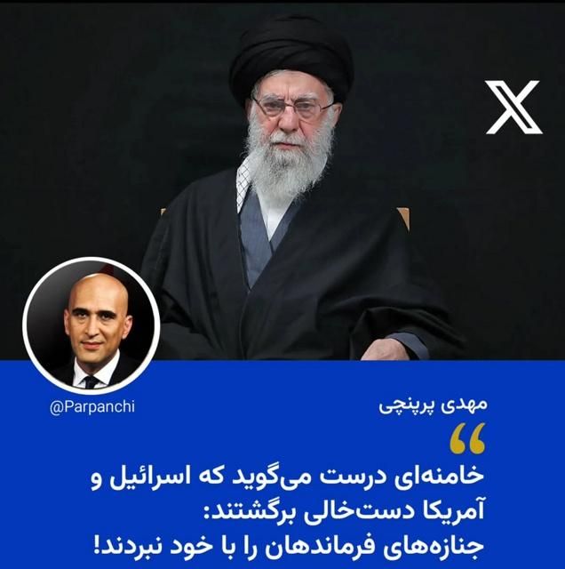 مهدی پرپنچی روزنامهنگار در «ایکس» به این ادعا واکنش نشان داده و مینویسد: «آیتالله خامنهای درست میگوید که اسرائیل و آمریکا دستخالی برگشتند: جنازههای فرماندهان را با خود نبردند!