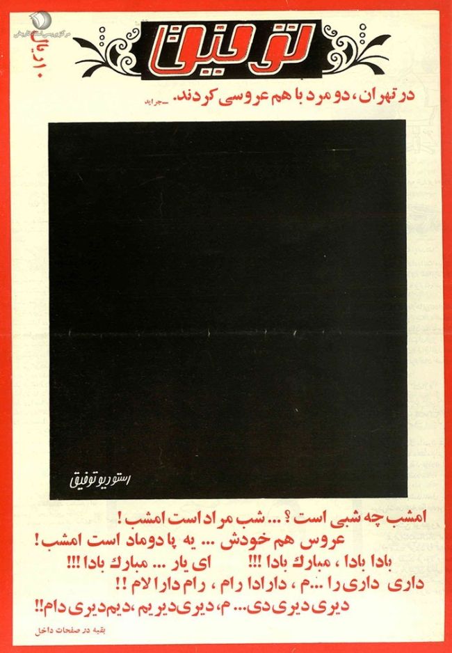 «این روزها خبر یک «عروسی»! عجیب شایع است که برای مردم، مردمی که هنوز شرافتمندانه و بدون انحراف و بدون فساد و لغزش زندگی میکنند، خبر این ازدواج حیرتانگیز بود و هر کس از قبیل مردم خبر را میشنید از تعجب نمیتوانست چشمش را تا تمام حدقه ندراند و دهانش را تا نیمه باز نکند... اما برای آن مردمی که در این «مراسم عروسی» بودند این امر بدیهی بود، اصلاً اتفاقی نیفتاده بود، خیلی که میخواستند جدی بگیرند، میگفتند این یک نوع «سلیقه» است، «تفنن» است... در این عروسی... هر دو طرف مرد هستند...