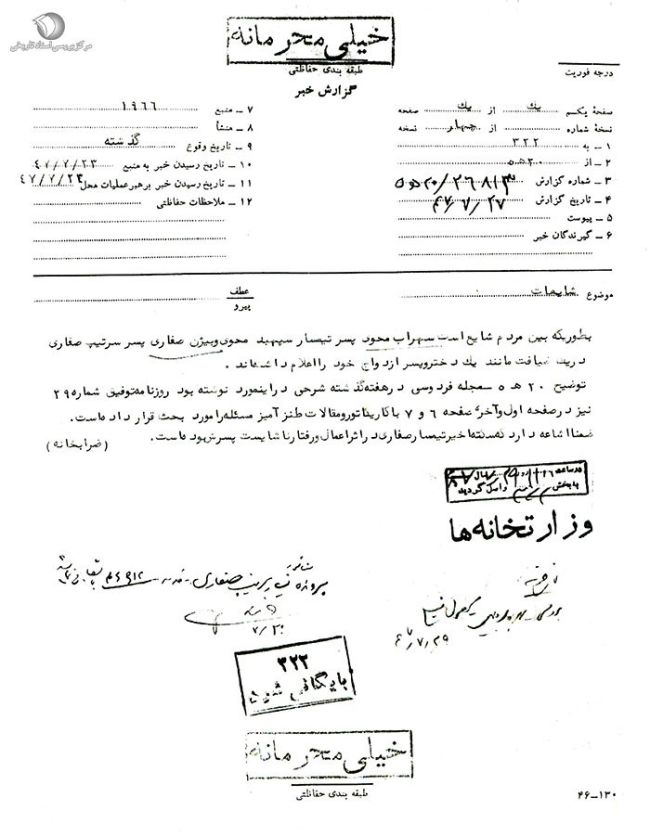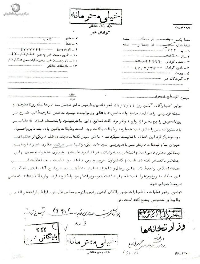 در سنا و ساواکدر اینجا متن سند به جا مانده از ساواک را به همراه تصویرش می خوانید و می بیند که به حواشی موضوع پرداخته و نوشته که حتی موضوع در مجلس سنا هم پیچیده بوده است.