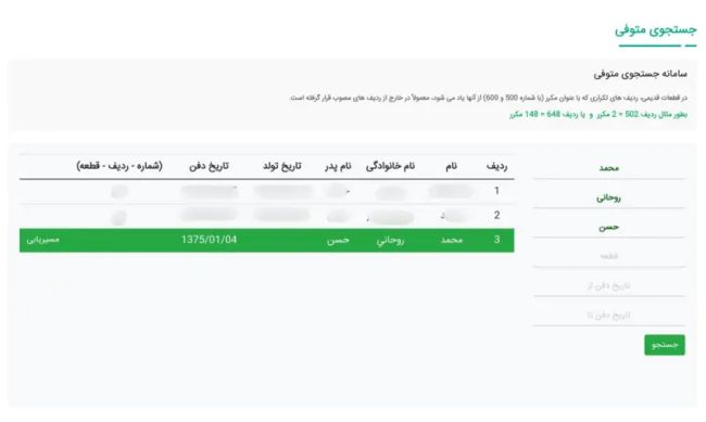 جستجو در سایت بهشت زهرا حاکی است که فردی به نام محمد روحانی فرزند حسن در روز ۴ فروردین ۱۳۷۵ در این قبرستان دفن شده است. محل دفن و تاریخ تولد این فرد ذکر نشده است.