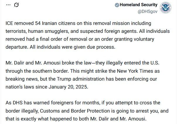 این وزارتخانه ماه گذشته میلادی در پیامی مربوط به دور اول اخراج ایرانیان اعلام کرد که در پرواز اول «۵۴ شهروند ایران» اخراج شدهاند؛ افرادی که به نوشته این پیام، برخیشان «تروریست، قاچاقچی انسان یا مظنون به فعالیتهای اطلاعاتی» بودهاند و همگی «روند قانونی برای اخراج» را طی کردهاند. در این بیانیه آمده بود که چند نفر از اخراجشدگان بهطور غیرقانونی از مرز مکزیک وارد خاک آمریکا شده بودند.