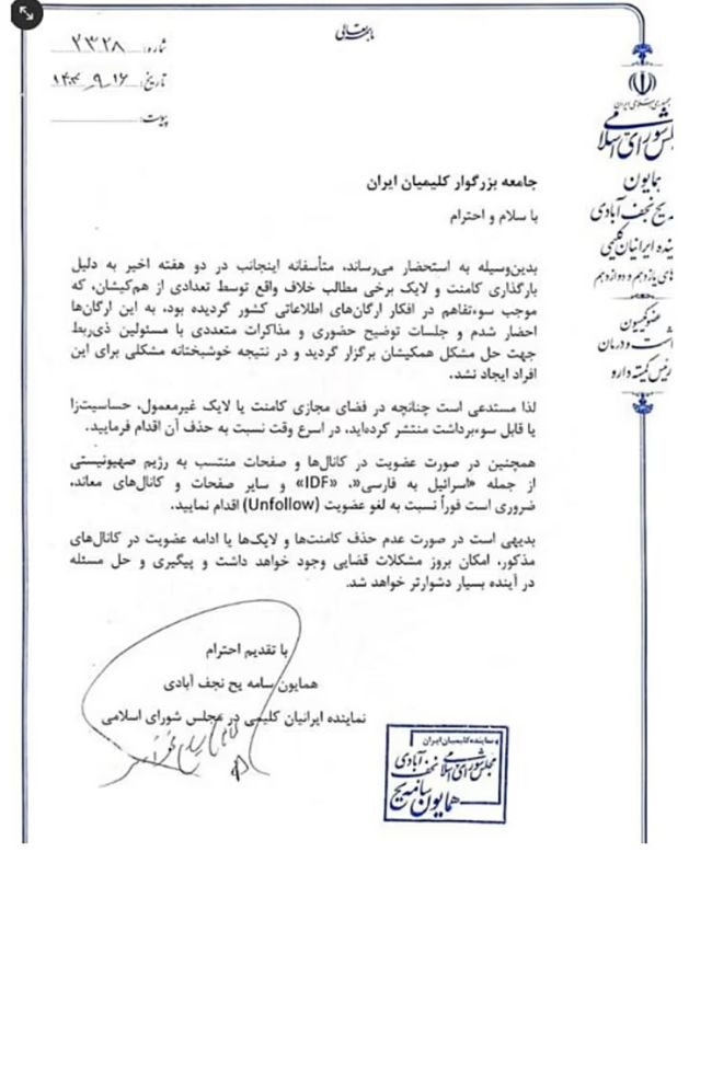 نامه همایون سامهیح نجفآبادی، نماینده کلیمیان در مجلس شورای اسلامیاو از همکیشانش خواست تا عضویت خود در هرگونه کانال «منسوب به رژیم صهیونیستی»، از جمله «اسرائیل به فارسی» و «سایر صفحات و کانالهای معاند» را لغو کنند تا از مشکلات قانونی احتمالی جلوگیری شود.پایگاه خبری واینت گلوبال اسرائیل که این خبر را منتشر کرده یادآوری کرده است که سامهیح در جریان جنگ دوازده روزه ایران و اسرائیل در ژوئن ۲۰۲۵ آشکارا برای ایران آرزوی پیروزی کرده بود.