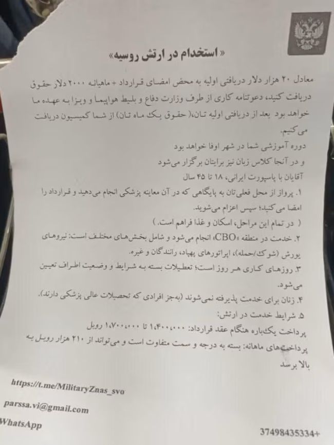 ایران اینترنشنال: سفارت روسیه در تهران انتشار شبنامهای که مردان ایرانی را به پیوستن به ارتش روسیه با وعده حقوق دلاری دعوت میکرد، «کلاهبرداری» خواند و تکذیب کرد. این واکنش در پی انتشار «شبنامهای» بود که تصاویر آن نیز در رسانههای اجتماعی منتشر شده است.به گزارش خبرگزاریها در ایران، سفارت روسیه در تهران سهشنبه ۱۸ آذر اعلام کرد: «افرادی سودجو در ایران با انتشار نامهای در فضای اینترنت اقدام به کلاهبرداری کردهاند.»