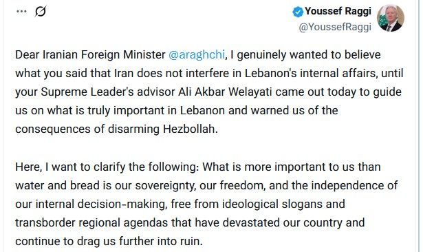 دولت لبنان دیگر نارضایتی خود را بهصورت پنهانی منتقل نمیکند، بلکه آن را با صدای بلند برای همه اعلام میکند. وزیر أمور خارجه لبنان سپس در مصاحبهای با شبکه الجزیره عربی حتی تأکید کرد که «حزبالله بدون تصمیم ایران نمیتواند سلاحهای خود را تحویل دهد»، اعترافی آشکار به این واقعیت که کنترل جنگ و صلح لبنان نه در بیروت، بلکه در تهران قرار دارد.