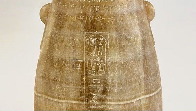 تیم پژوهشی دریافت که روی این ظرف مرمری، کتیبهای به چهار زبان باستانی اکدی، ایلامی، فارسی و مصری حک شده که به خشایارشا یکم، پادشاه هخامنشی که بین سالهای ۴۸۶ تا ۴۶۵ پیش از میلاد حکومت میکرد، اشاره دارد.
