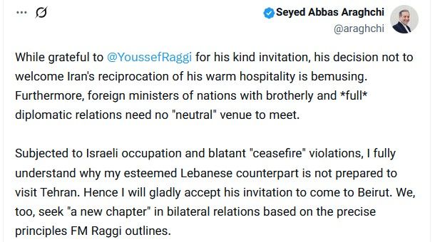 عراقچی در پیامی در رسانه اجتماعی «ایکس» نوشت دعوت به بیروت را «با کمال میل» میپذیرد، اما تصمیم همتای لبنانی خود برای نپذیرفتن دعوت ایران را غیرمنتظره دانست و افزود وزیران خارجه کشورهایی که «روابط دیپلماتیک کامل» دارند، برای گفتوگو نیازی به محل «بیطرف» ندارند.