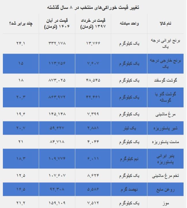 مقایسه قیمت مواد غذایی پرمصرف توسط خانوارهای ایرانی نشان میدهد که افزایش قیمت کالاهای خوراکیها نیز از جهش ۱۷ برابری متوسط سطح عمومی قیمتها بیشتر بوده و فشار بالاتری بر سبد مصرفی خانوارها وارد شده است. چنان که بررسی تغییر ۲۰ قلم خوراکی منتخب در فاصله بهار ۱۳۹۷ تا پاییز ۱۴۰۴ حاکی از این است که قیمت این اقلام بر پایه نرخهای متوسط گزارش شده توسط مرکز آمار ایران به طور متوسط ۲۰ برابر شده است.