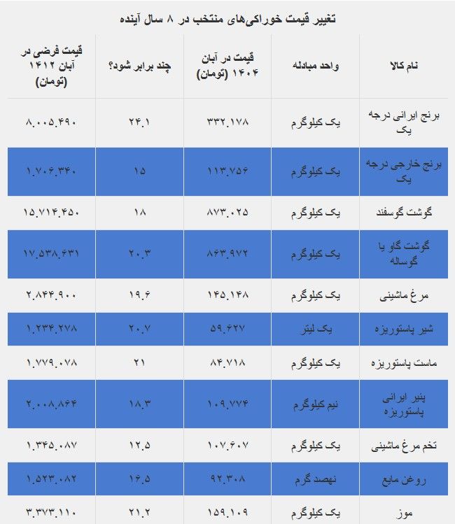 در مورد اقلام خوراکی نیز اگر طی ۸ سال آینده نیز جهشی قیمتی معادل آن چه که در ۸ سال گذشته تجربه کردند، رخ دهد، به عنوان نمونه بهای هر کیلوگرم برنج ایرانی درجه یک میتواند به ۸ میلیون تومان برسد و قیمت هر کیلوگرم مرغ هم احتمالا به بیش از ۲.۸ میلیون تومان میرسد.