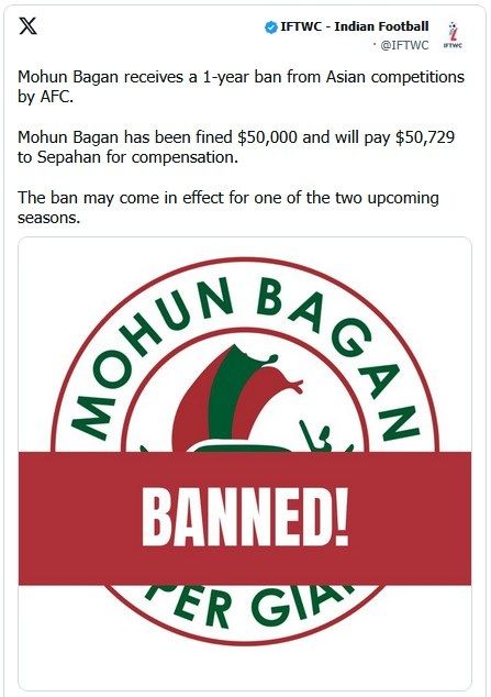 کنفدراسیون فوتبال آسیا، تیم هندی «موهون باگان سوپر جایِنت» را بهدلیل خودداری از بازی در ایران بیش از صد هزار دلار جریمه کرد.این تیم همچنین به مدت یکسال از بازی در مسابقات در قاره آسیا محروم شده است.
